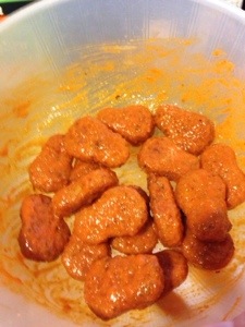Once both boxes of nuggets were cooked according to the directions, I tossed each in one of the sauces and served with homemade bleu cheese dip and celery.